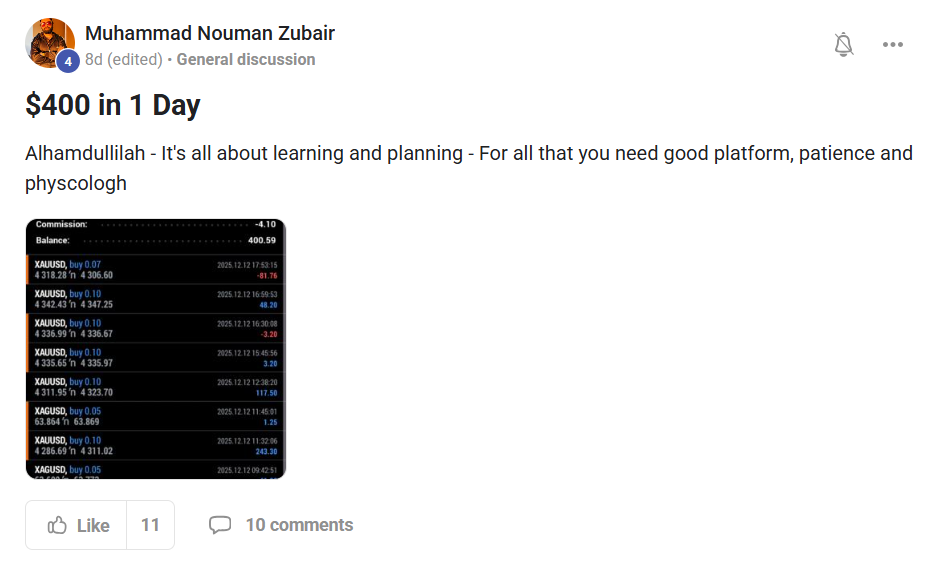 Direct access to Nouman, live Q&A sessions, trade reviews, and weekly accountability check-ins.